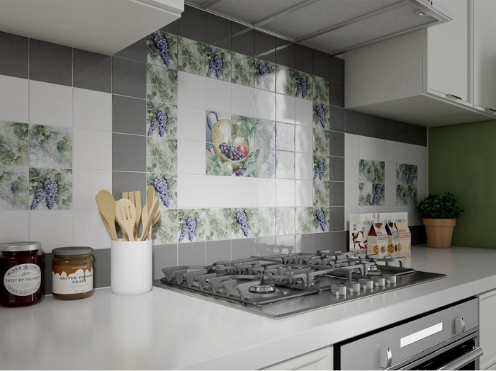 Плитка с рисунком на кухне - старомодное решение. / Фото: rdmkuhni.ruКерамическая плитка должна быть максимально лаконичной, без обилия рисунков и узоров. Не нужно с ее помощью выкладывать целые сюжеты в ванной комнате или на кухне. Лучше приобрести мозаику или однотонную плитку, которая идеально подойдет под общий интерьер. Некоторые хозяйки пытаются пойти, по их мнению, наиболее оптимальным путем – купить плитку с надписями или изображениями еды и «точечно» разместить ее на стене, чтобы разбавить основное настенное покрытие. Однако этот прием также возвращает нас в прошлое – помните, в советское время были картинки, которые клеили на кафель? Вы же не хотите повторять этот опыт?