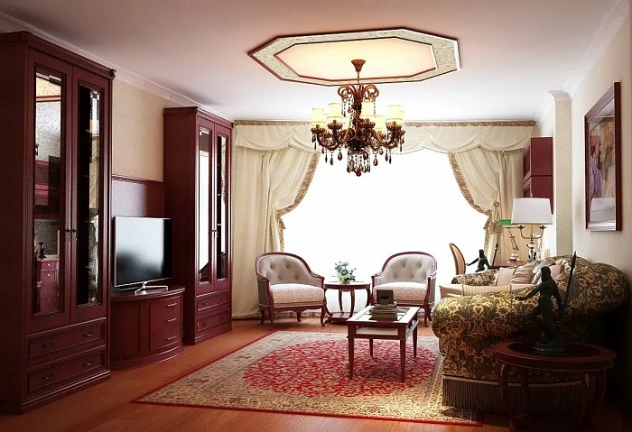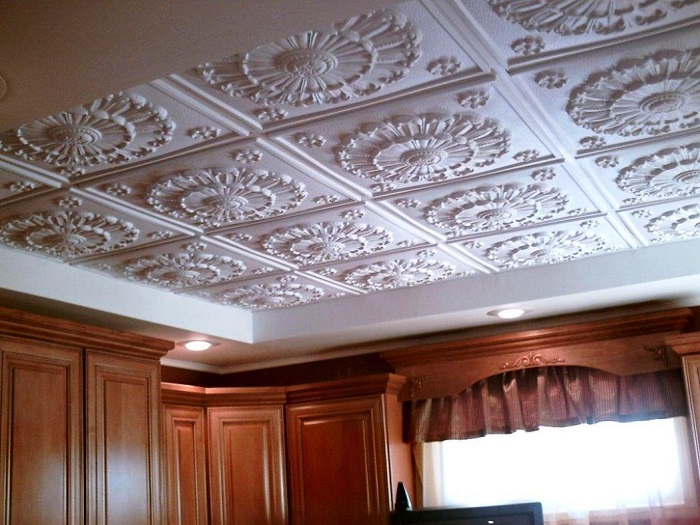 Потолочная плитка с рельефом в интерьере. / Фото: Krovati-i-divany.ruНачиная с 1990-го и заканчивая 2000-ми, в моде была потолочная плитка. В квартирах обеспеченных людей можно было встретить варианты с рельефом, которые на тот момент считались признаком высокого статуса и роскоши. Однако сейчас дизайнеры смело говорят о том, что такая плитка не только выглядит нелепо, но еще и зрительно уменьшает высоту потолка, что является губительным для маленьких квартир. То же самое можно сказать и о натяжных потолках, особенно многоуровневых конструкциях со сложной подсветкой. Если вы не хотите чувствовать себя в квартире, как в замкнутом пространстве, просто выровняйте потолок и покрасьте его в белый цвет. Так на вас ничего не будет «давить».