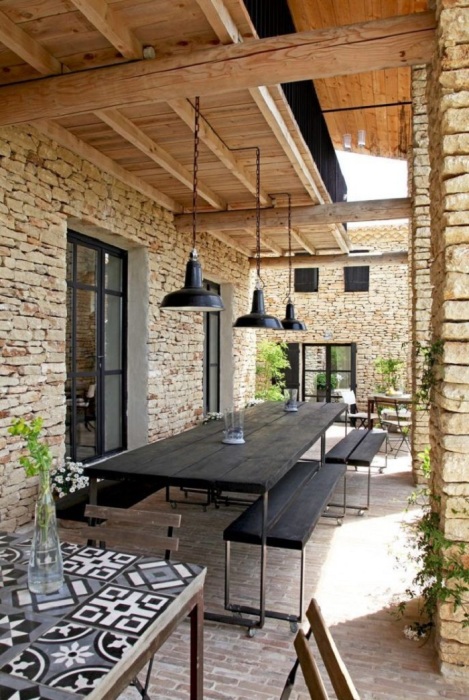 Лофт - это контраст грубой отделки и изысканных аксессуаров. / Фото: fermer.blogСамым практичным в вопросе оформления веранды является лофт – парадоксальный стиль, который объединил в себе богемность и андеграунд, бедность и роскошь. Для него характерны простор и свободная планировка, контраст грубой отделки и изысканных аксессуаров. Лофт позволяет использовать в интерьере различные предметы, которые до этого пылились в гараже, превращая их в произведения искусства.Если в провансе главным материалом является дерево, то в лофте – железо. Оно не обязательно должно блестеть, как новое, подойдут и потертые экземпляры, будто испачканные машинным маслом. Еще один важный атрибут стиля – потертая кожа коричневого цвета. Иногда используется бетон и дерево. Выбирая мебель для веранды, следует помнить, что она должна быть стильной и в небольшом количестве. Отдайте предпочтение деревянному столу на железных массивных ножках и грубым стульям. Вместо них можно поставить диван, сделанный своими руками. Для этого сварите между собой тонкие пруты, которые станут каркасом, и положите сверху несколько больших подушек из плотной ткани.