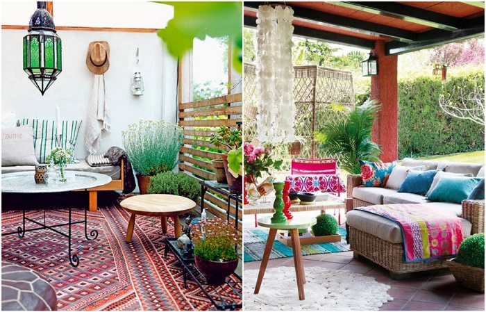 Бохо-шик - это сочетание пестрых цветов и старинных вещиц. / Фото: Pinterest.ruЕсли вам близки по духу пестрые принты и старинные вещи из разных стран, значит бохо-шик – это то, что вам нужно. Он представляет собой сплетение элементов разных стилей, начиная с гранжа, фолка, и заканчивая винтажным. Такая веранда может стать собранием ваших впечатлений от поездок и путешествий, а в центре будут привезенные из-за границы сувениры. Это могут быть восточные ковры, вазы в индийском стиле, азиатские деревянные полочки и так далее.Для бохо-шик характерны яркие цвета (красный, оранжевый, желтый, зеленый), самобытный рукотворный декор, обилие мебели и аксессуаров, порядок, который граничит с беспорядком, использование натуральных материалов. Веранду украсят полы, столики, табуреты из дерева. Стены также можно частично облицевать досками. Что касается декора, то идеальным вариантом станут изделия из ротанга, соломы, джута. Также можно использовать гламурные детали: бисер, перья, кружево, мех.