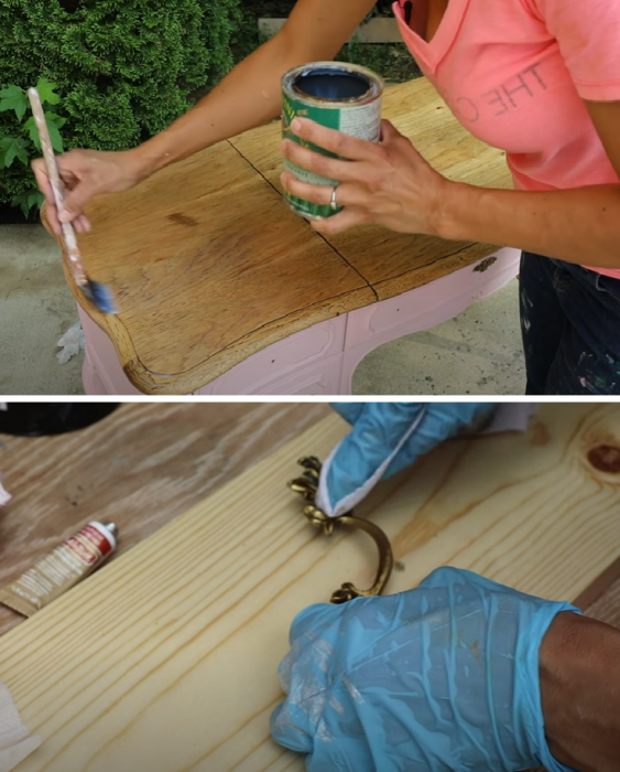 Процесс окрашивания основной части французского столика. | Фото: youtube.com/ © Thrift Diving.Поскольку новая владелица французского столика решила сделать его гламурным и покрасить в бледно-розовый цвет, пришлось смешивать несколько цветов краски, чтобы получить желаемый оттенок. Окрашивание Серена начала с нижних элементов, чтобы можно было откорректировать цвет, если его тон не понравится.