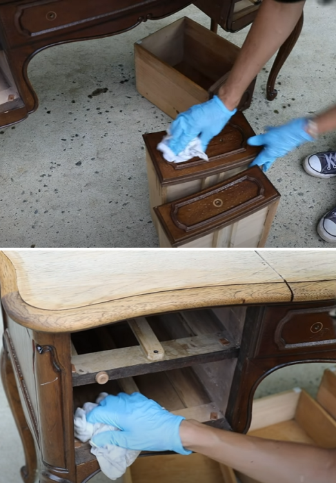 Перед покраской все поверхности и внутреннюю часть нужно тщательно вымыть. | Фото: youtube.com/ © Thrift Diving.После того, как все пыльные работы закончились, можно было приступать к очистке как самих ящиков, так и внутреннего пространства старого туалетного столика. Для этих целей прекрасно подходят очищающие жидкости или обычный обезжириватель для мытья посуды, пульверизатор и мягкая тряпка.