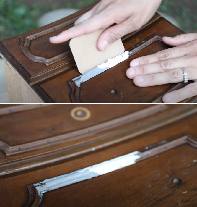 Поврежденную часть деревянного молдинга можно отреставрировать с помощью шпаклевки. | Фото: youtube.com/ © Thrift Diving.Поскольку на одном из ящиков был поврежден молдинг, его пришлось восстанавливать. Для этих целей мастерица взяла обычную финишную шпаклевку, с которой пришлось хорошенько повозиться. Но результат получился достойным, поэтому можно было смело приступать к грунтованию фасадов ящиков и их покраске.