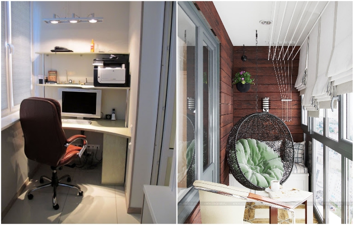 На балконе/лоджии можно оформить полноценную зону отдыха или рабочий кабинет. | Фото: balkonsami.ru/ divandi.ru.Несмотря на то, что балкон или лоджия считаются нежилой зоной, при рациональном использовании всех площадей квартиры можно и их использовать с пользой. Причем не в стандартном понимании, устроив на них склад неиспользуемых или поломанных предметов и вещей, а именно как дополнительное жилое пространство. Единственное, что для этого понадобится утеплить балкон/лоджию, продумать безопасное освещение, обогрев и охлаждение в жарких регионах.