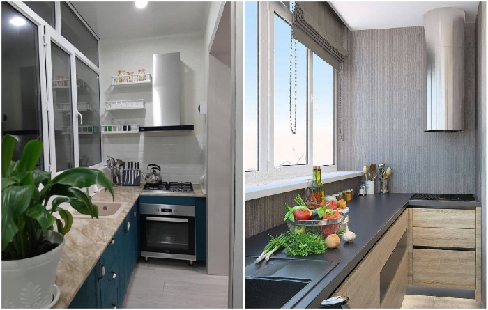 Даже узкую кухню можно сделать и уютной, и функциональной. | Фото: es.postila.io/ roomble.com.Тем, кому не повезло с маленькой кухней, дизайнеры советуются по максимуму избавиться от всего лишнего или найти место для хранения дополнительных комплектов столовых приборов в других комнатах. И только потом начинать скрупулезно, сантиметр за сантиметром, распределять самые необходимые оборудование, технику, мебель, кухонную утварь и посуду. Если все это удалось втиснуть в скромное пространство, остается лишь поддерживать чистоту.