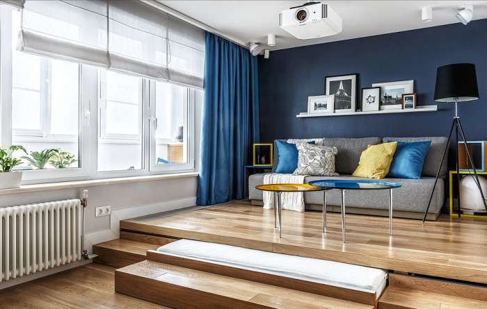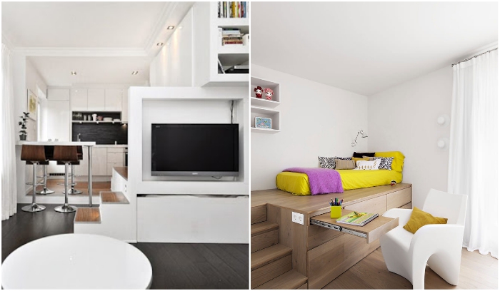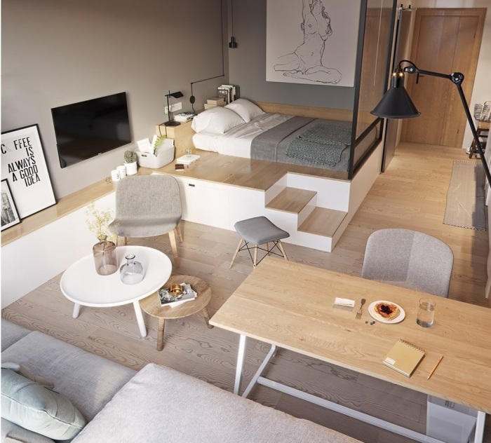 Тот случай, когда в подиум можно спрятать все и даже кровать. | Фото: ivd.ru.Как правило, квартира-студия, даже если она такого же размера как и малогабаритная «однушка», смотрится намного больше из-за отсутствия перегородок, поэтому владельцам подобного жилья дизайнеры рекомендуют поднимать одну из зон на подиум. Таким образом можно зрительно разделить пространство на несколько жилых «комнат». Тем более, что подиум тоже можно сделать многофункциональным – предусмотреть создание нескольких систем хранения.