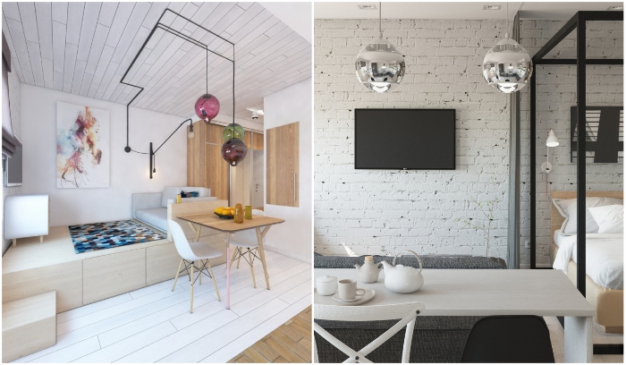 Фактурной и акцентной может быть не только стена, но и потолок или пол. | Фото: homebuilding.ru/ roomble.com.Так уж повелось, что все дизайнеры советуют в крошечных пространствах использовать белый цвет, который имеет массу оттенков и тонов. И это разнообразие поможет избежать «стерильности операционной», особенно если подключить фактуру материала. Например, не всегда оправдан белый глянец, а вот имитация кирпича или матовые декоративные вставки в виде акцентной стены очень даже разнообразят дизайн интерьера.