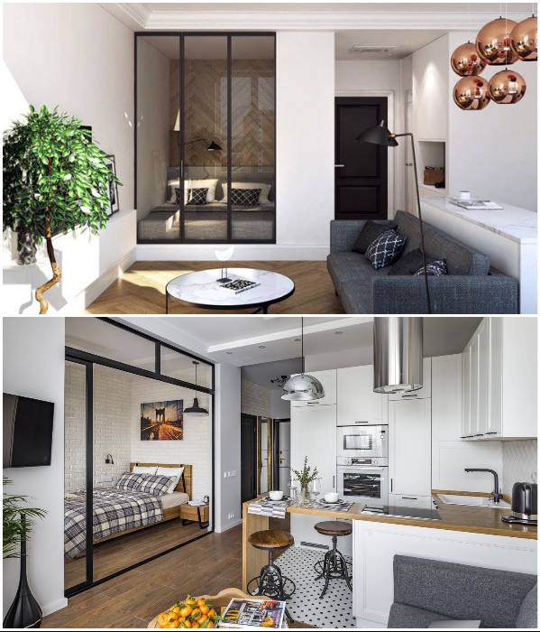 За стеклянной перегородкой клаустрофобия не грозит. | Фото: lakbermagazin.hu/ pinterest.com.Если так сложилось, что приходится жить в квартире-студии или жилая комната одна, то все же стоит отделить спальное место от остальных жизненно важных зон. Если до недавнего времени в приоритете было создание перегородок из мебели, то теперь дизайнеры советуют отойти от этого правила, особенно если пространство ограничено. Для этих целей лучше всего подойдут раздвижные стеклянные системы, которые не уменьшают площадь, а как раз-таки наоборот – визуально увеличивают. Довольно стильно и оригинально смотрятся перегородки или двери, если это ниша, как из прозрачного стекла, так и зеркальные поверхности. Также можно использовать колоритные японские двери из полупрозрачной бумаги, закрепленной на тонкой деревянной раме (седзи) или интересные шторы.