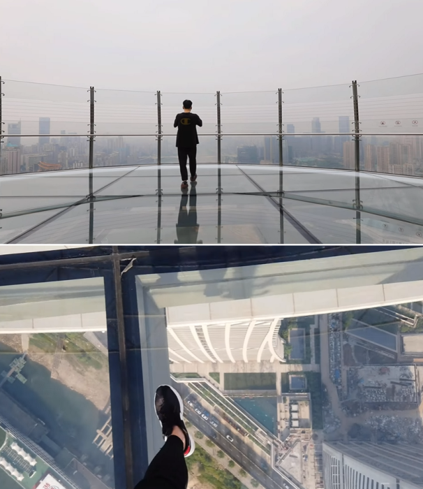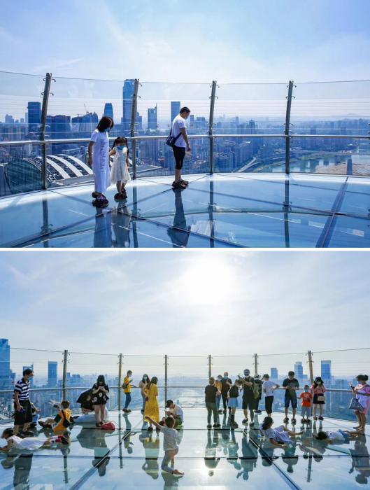 Со смотровой площадки открывается умопомрачительный вид в любое время суток («Crystal», Китай). | Фото: youtube.com/ © CapitaLand.Только после этого экстремалы смогут сполна насладиться умопомрачительным видом под ногами на высоте 250 м. Несмотря на то, что это все-таки аттракцион не для слабонервных, желающих прогуляться по стеклянному полу хоть отбавляй.