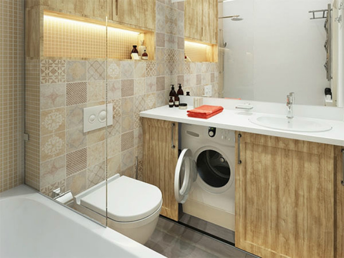 Стиральная машинка под столешницей. | Фото: Труд.На фото - прекрасный пример того, где и как можно разместить стиральную машинку. Дизайнеры убрали верхнюю крышку и установили машинку под столешницей. Если отдать предпочтение накладной раковине с компактным сифоном, рядом со стиральной машинкой еще останется место для вместительной корзины для белья.