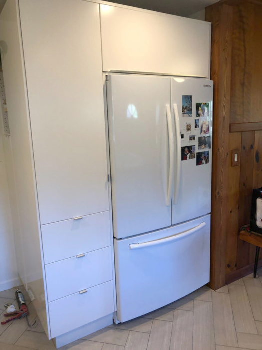 Ну и ну! / Фото: reddit.com/user/tobynylinНемногие люди осознают, что покупная мебель намного дороже, чем заказанная из распила. Данная идея поможет сэкономить буквально до 50 процентов места в вашей кухне. Ставим холодильник в удобное место в углу. Затем заказываем по чертежу из распила подходящие шкафы, которые будут располагаться сбоку и над холодильником. Теперь все продукты, вся посуда и вся кухонная утварь умещаются всего лишь в 6 квадратных метрах, но... В ВЫСОТУ!!!