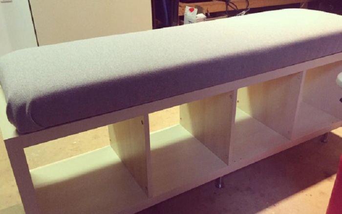 Вот это идея!!! / Фото: reddit.com/user/bearsnsealsСквозная полка или стеллаж стоят недорого. Приобретите сквозную полку, затем поставьте в удобное место в кухне на бок, организуйте внутри полок зону хранения для чайников и подносов, а вот сверху сделайте сидение из поролона и ткани. Подойдет любой фрагмент фанеры. Очень простое решение!