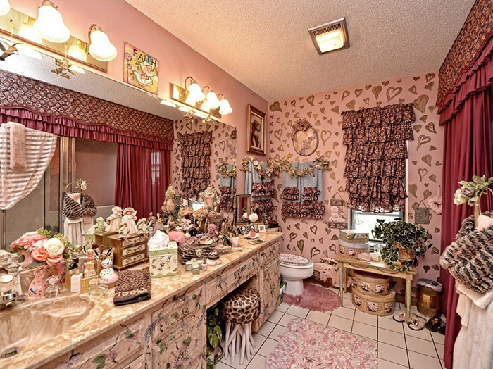 Глядя на буйство красок и переизбыток статуэток, шкатулок, рюшей и оборок сразу и не поймешь, что это ванная комната. | Фото: awesomeinventions.com.Ну а венцом всех стараний того, кто так усердно расписывал все детали и загромождал каждую поверхность всевозможным декором, стала ванная комната. Такого взрыва эмоций не встретишь даже в будуарах дворцовых красоток эпохи королевы Виктории. Фанатичное изобилие декора просто сбивает с толку и сразу даже не сообразишь, зачем зашел в уборную. Конечно же, похвально, что хозяйка под цвет штор подбирала банные полотенца, но все остальное абсолютно неуместно в ванной, но на вкус и цвет товарищей нет.Справка от редакции Novate.ru: За этот необычный дом фанатично-креативные владельцы просили 400 тыс. дол., но с припиской, что торг уместен. Как дальше сложится судьба дома и будет ли настолько увлечен новый хозяин «розовым раем», чтобы сохранить существующий дизайн – неизвестно.Чтобы не уподобляться подобным «дизайнерам» и не заниматься пустым украшательством, стоит знать, от чего лучше избавиться или заменить в интерьере своей квартиры уже сейчас, чтобы потом не краснеть перед гостями.