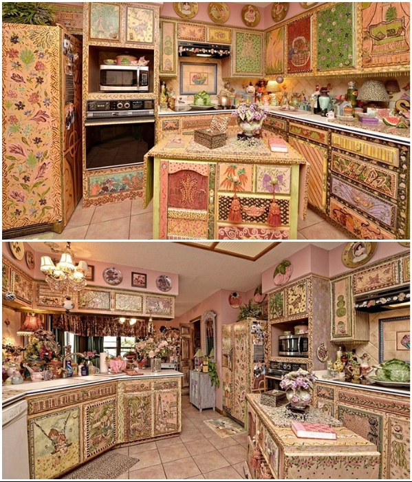 Расписная кухня с кисточками на ручках кухонного гарнитура даже для любителей всего экзотического – уже перебор. | Фото: awesomeinventions.com.Сказочно-цветочные мотивы в зефирно-розовых тонах украшают всю бытовую технику, столешницы, фасады кухонного гарнитура и текстиль. Исключением стала лишь посудомоечная машина, которая чудом осталась нетронута и теперь белым пятном выделяется на пестром фоне интерьера. Не остались без особого внимания горе-дизайнера даже узкие пролеты стен под потолком – на них красуются расписные декоративные тарелки.Чего стоит только холодильник, который с особой настойчивостью разрисовывали всевозможными вензелями, цветами и милыми зайками? А кисточки на ручках ящиков и дверей кухонных тумб?