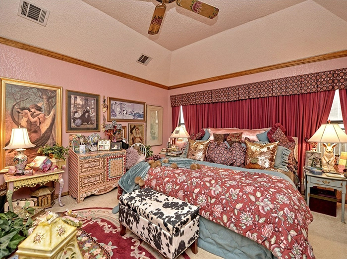 Перенасыщенность красками, обилие предметов и вещей в спальне вряд ли поспособствуют здоровому сну. | Фото: awesomeinventions.com.Спальня под стать интерьеру остальных комнат, здесь также не обошлось без помпезных штор, обилия картин, «леопардовых» пуфов и диванчиков, изящных французских столиков и раритетных комодов, украшенных если не цветочным рисунком, так благородными кракелюрами, присущими стилю шебби-шик. Но и этого для владельцев оказалось мало, чтобы наслаждаться разнообразием подушек на кровати, даже лопасти потолочного вентилятора тоже вычурными узорами.