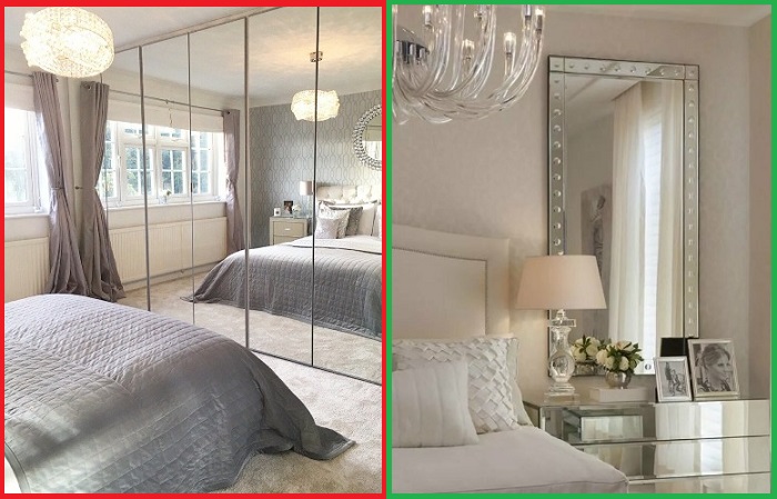 Зеркало лучше располагать сбоку от кроватиЗеркало напротив кровати вызывает внутренний дискомфорт и эффект чужого присутствия. Согласитесь, легко испугаться, когда вы просыпаетесь ночью, чтобы попить воды, и обнаруживаете свое отражение на противоположной стене. Поэтому стоит отказаться от идеи разместить шкаф с зеркальными дверями вдоль кровати или вешать зеркало в непосредственной близости к постели.Если вы не представляете комнату без зеркального шкафа-купе, постарайтесь разместить его в противоположном углу от кровати, в крайнем случае – сбоку от нее. Что касается самостоятельного зеркала, что он можно поставить/повесить со стороны прикроватных тумбочек либо на уровне изножья кровати. Отличная идея – приобрести зеркало на колесах, которое можно будет передвигать в какую угодно точку комнаты.Также узнайте Как оформить спальню мечты в маленькой комнате: 10 идей из разных стран