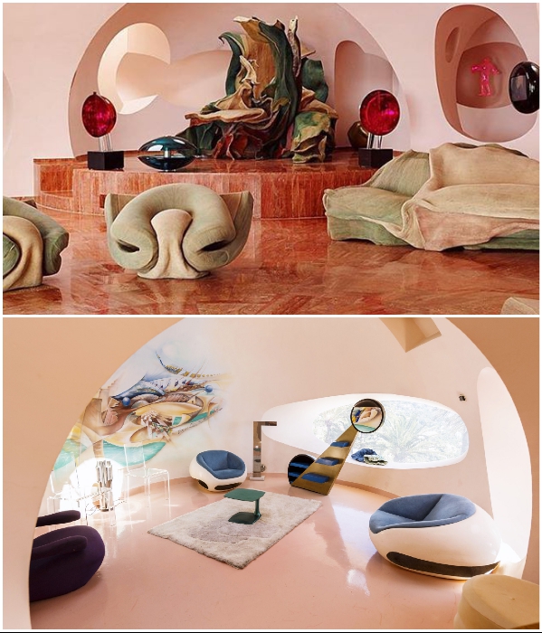 Каждый из «пузырей» был оформлен разными известными художниками современности. | Фото: magazine.bellesdemeures.com/ esquire.ru.«Palais Bulles» представляет собой сложную систему гротов, соединяющихся оригинальными туннелями и имеет довольно внушительную площадь – 1,2 тыс. кв. м. В нем оформлено 10 жилых комнат, огромных размеров гостиная-столовая, холл, амфитеатр на 500 зрительских, с которого открывается фантастический вид на Средиземное море, имеется несколько бассейнов, разбиты экзотические сады, а также созданы искусственные водопады. И за все это добро хотят выручить 390 млн дол., но почти за 4 года покупателей так и не нашли.