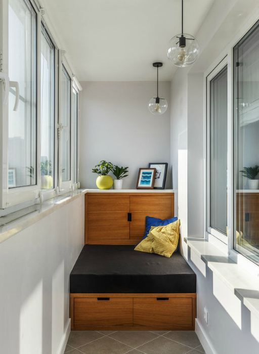 Светлая лоджия с оригинальным диванчиком. | Фото: InMyRoom.Узкая лоджия с белыми стенами, изюминкой которой стал стильный функциональный диванчик, сделанный на заказ. Изделие выполнено в оттенке «тик» и состоит из двух вместительных шкафчиков, один из которых расположен в спинке, а второй в основной части, и серого поролонового сиденья.