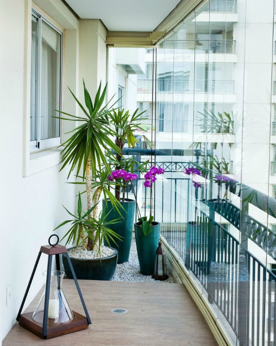 Растения на балконе. | Фото: Дизайн Эксперт.Некоторые люди используют балкон для выращивания цветов. Даже на очень узкой лоджии найдется место для пары больших красивых кадок с пальмами и для множества маленьких горшочков. Дополните интерьер декоративной галькой и небольшим стулом, чтобы наслаждаться отдыхом в окружении зелени и цветов.