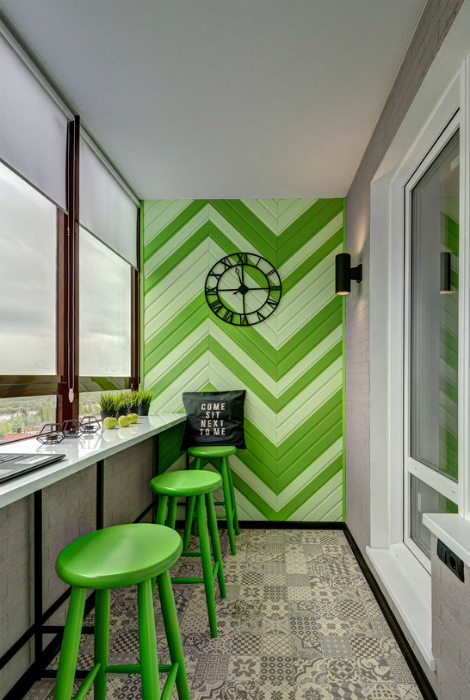 Лоджия с акцентной стеной. | Фото: Pinterest.Если вам не хватает солнца и ярких красок, добавьте своему балкону цвета. Яркая акцентная стена с узкими панелями приятных зеленых оттенков и барные стулья тех же тонов помогут разбавить скучный интерьер и будут заряжать на позитивный лад.