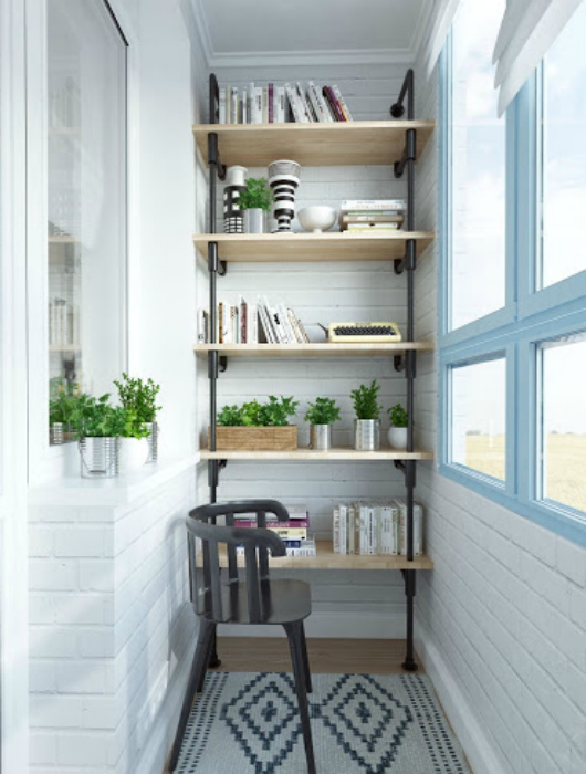 Эффектный стеллаж для маленького балкона. | Фото: Decorating HQ.Узкий балкон - не место для громоздкой мебели. Если собираетесь использовать пространство для отдыха, ограничьтесь оригинальным стеллажом, например, в индустриальном стиле. Дополнить обстановку поможет палас с принтом, цветы в горшках и аккуратный стул или небольшое кресло.