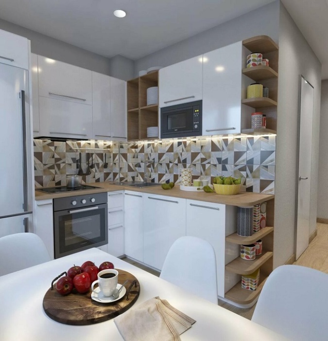 Акцентный фартук украсит интерьер. / Фото: pinterest.ruАкцентная бытовая техника или стена не являются единственными возможными вариантами и панацеей от всех болезней. Можно задействовать кухонный фартук. Учитывая огромное разнообразие материалов, которые используются для его укладки (плитка, панели, фотопечати), грех не воспользоваться представленной возможностью.Если кухня белая или выполнена в светлых оттенках, то есть является нейтральной, попробуйте оформить необычный фартук из яркой мозаичной плитки. Однако обратите внимание, что она должна быть не слишком мелкой, иначе уход за ней существенно осложнится. Кроме того, старайтесь не использовать много разных цветов. По словам архитектора Анны Новопольцевой, яркие акценты на кухне должны присутствовать в минимальном количестве, как и общее число декора.