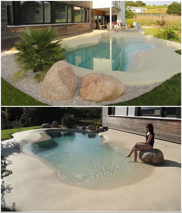 Песчаный бассейн у дома – идеальное место отдыха для всей семьи. | Фото: mymodernmet.com.По сведениям редакции Novate.ru, главное и самое весомое преимущество рукотворного берега и пляжа состоит в том, что песок не нагревается даже в самую жаркую погоду и под прямыми солнечными лучами. Также по нему не будут скользить ноги как на керамической плитке или природном камне, даже если идти по мокрому покрытию. Как отмечается в рекламном проспекте и подтверждают владельцы собственного тропического или средиземноморского рая (кому как нравится), это сооружение легко чистить и поддерживать в нем порядок, ведь для этой процедуры не требуются дополнительные приспособления.