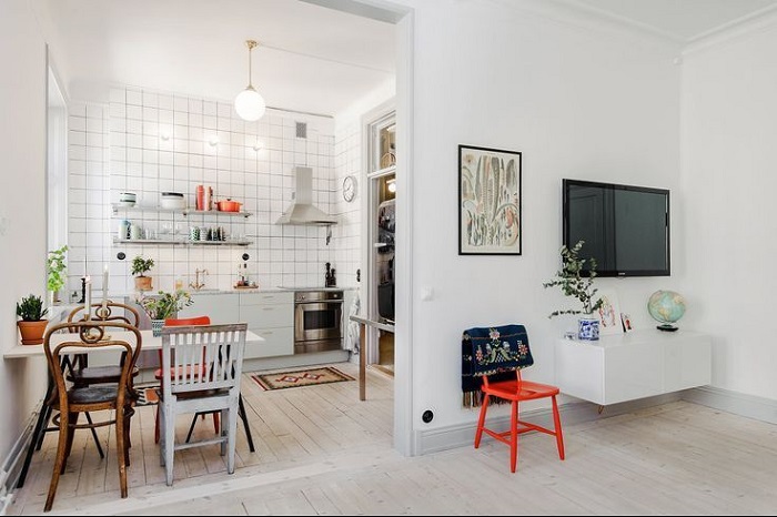 В скандинавском стиле используется светлая цветовая гамма. / Фото: inmyroom.ruСейчас этот стиль является одним из самых популярных благодаря своей простоте, лаконичности, уюту и универсальности. Скандинавские интерьеры очень светлые и просторные, поэтому идеально подходят для небольших квартир, например, хрущевок.Основные правила стиля:• Светлая цветовая гамма – так как солнце является нечастым гостем в северных странах, таких как Норвегия, Швеция, Дания, главная задача при оформлении интерьера – добавить больше света. Чтобы выполнить эту задачу, местные дизайнеры используют белую или серую краску для отделки стен и потолка. Так комнаты становятся не только светлее, но и просторнее, ведь данные цвета помогают визуально увеличить комнату.• Простота и лаконичность – в этом скандинавский стиль чем-то похож на минимализм, для которого тоже характерна функциональная и нейтральная мебель. Что касается вычурных и громоздких вариантов, то они категорически не подходят для такого интерьера, так как загромождают пространство.• Яркие акценты – чтобы интерьер не выглядел слишком блеклым и стерильным, в него нужно добавить яркие акценты, и растений будет недостаточно. Поиграйте с текстилем – желтые шторы на кухне, синие полотенца в ванной, зеленые подушки в спальне. Желательно, чтобы в комнате присутствовало хотя бы три предмета, которые будут перекликаться по цветам. Так интерьер будет выглядеть как цельная картинка.