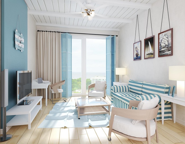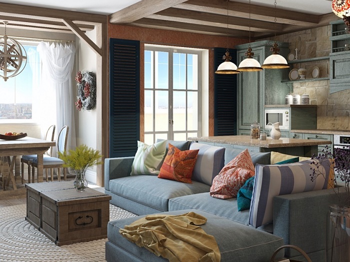 Средиземноморский стиль ассоциируется с морем. / Фото: dizainexpert.ruСредиземноморский стиль наполнен ощущением беззаботности, легкости, спокойствия. Такой интерьер вызывает стойкие ассоциации с морем, криком чаек, песчаным берегом и звуком волн, разбивающихся о скалы. Главной концепцией стиля является легкость во всем. Здесь нет места вычурности, экстравагантности, роскошному декору. Только доступность, функциональность, практичность и продуманность деталей.Особенности стиля:• Стены с большими окнами – обязательным условием средиземноморского стиля является наличие белых стен с огромными окнами. Стены редко бывают ровными, чаще фактурными – их штукатурят, покрывают несколькими слоями краски, иногда декорируют мозаикой, деревянными или каменными элементами.• Бело-синяя цветовая гамма – комбинировать эти два цвета в интерьере можно по-разному: белые стены и синяя мебель, белые стены и синий пол, белая мебель и синий текстиль. Главное, чтобы эти оттенки были главными в квартире.• Массивная мебель – для средиземноморского интерьера может быть подобрана разная мебель, но в большинстве случаев она массивная, тяжелая, прочная, сделана из темного дерева (визуально похожа на ту, которую используют в рустикальном стиле). В некоторых квартирах может располагаться плетеная мебель. Предметы интерьера одновременно могут быть потрепанными и утонченными, если на них присутствует резьба или мозаика. Кресла и диваны украшаются текстилем, в частности, чехлами и цветными подушками. Узоры сильно зависят от региона: например, в Греции любят лаконичные ткани без рисунка, а в Испании популярные марокканские мотивы.