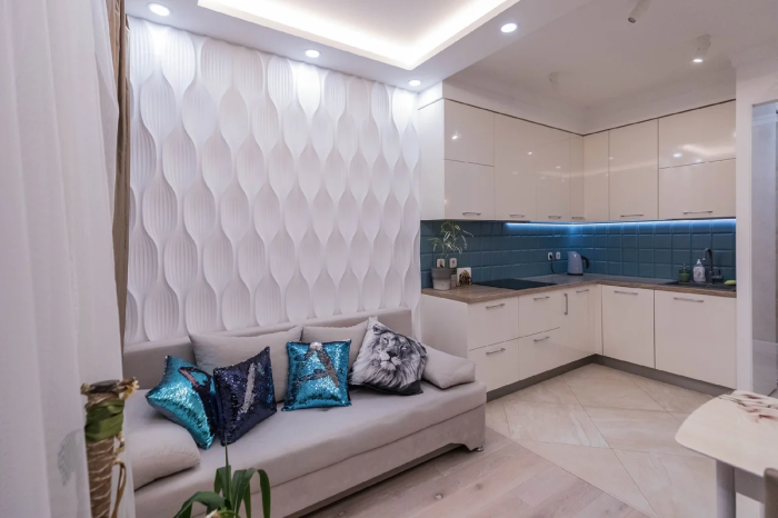 Дизайнерское оформление гостиной зоны в небольшой «евродвушке». | Фото: onashem.mediasole.ru.Сама же гостиная получилась очень светлой. Два узких окна и прозрачные занавески на окнах привнесли воздушность и объем в небольшое пространство. Чтобы не перегружать имеющуюся площадь разноцветьем и зрительно не выделять гостиную, акцентную стену сделали из фактурных гипсовых панелей белого цвета, которые органично смотрятся в ее интерьере. Основной же палитрой все так же остались молочно-песочные оттенки. Выразительности и свежести добавили лишь яркими вкраплениями в виде блестяще-голубых диванных подушек и комнатных цветов.