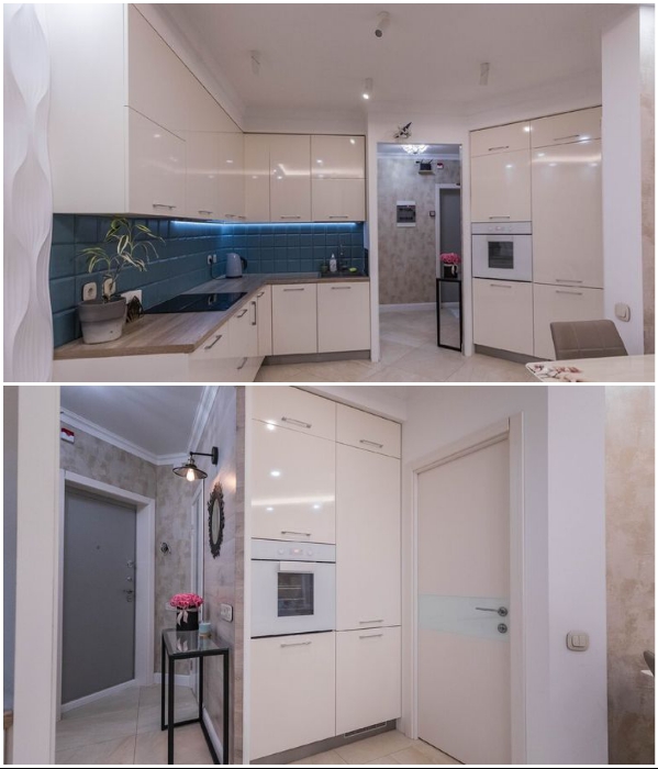 Удачная планировка позволила разместить кухонный гарнитур и встроенную технику вдоль стен и перегородки. | Фото: lemurov.net.Бело-молочные фасады кухонного гарнитура со встроенной техникой отлично сочетается с песочного оттенка столешницей и напольной плиткой. А вот фактурный фартук с четкими геометрическими фигурами цвета морской волны становится ярким акцентом всей зоны приготовления пищи. Поскольку кухня осталась без окна, то нужно было устанавливать достаточное количество осветительных приборов. В этом случае дизайнер остановила свой выбор на нескольких спотах, которые органично смотрятся на матовом белом потолке.