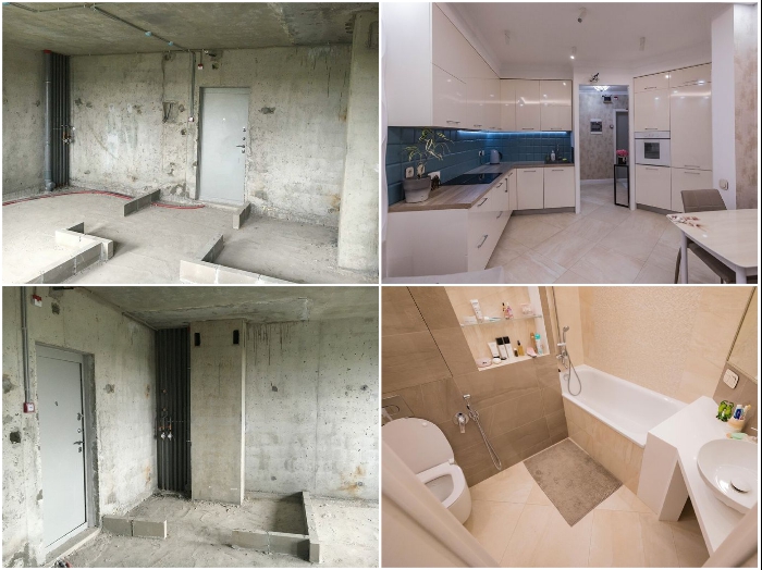 Квартира была приобретена в черновой отделке. | Фото: onashem.mediasole.ru.Справка: «Евродвушка» - это по сути однокомнатная квартира, в которой есть отдельная спальня и большая комната, объединенная с кухней – гостиная-кухня. Если рассматривать в процентном соотношении, то основная комната будет иметь 30-40% площади, остальные же «квадраты» пойдут на организацию ванной, туалета и спальни, а вот узкого коридора (частенько абсолютно бесполезного!) уже не будет. В эконом-вариантах подобное жилье значительно меньше полноценной двухкомнатной квартиры (а значит дешевле), но больше, чем современные однокомнатные.
