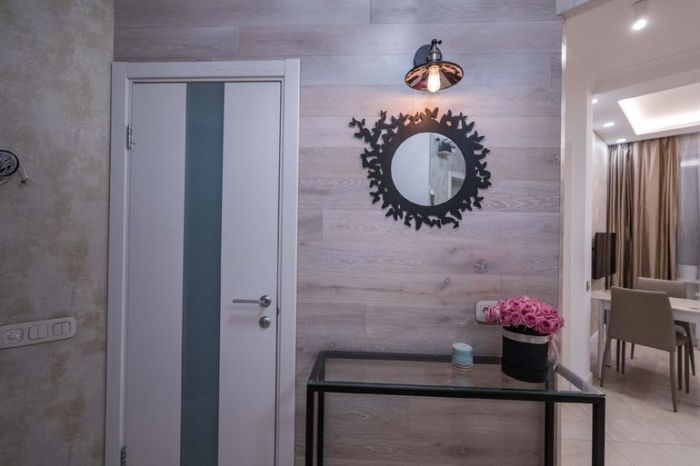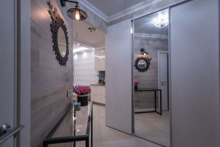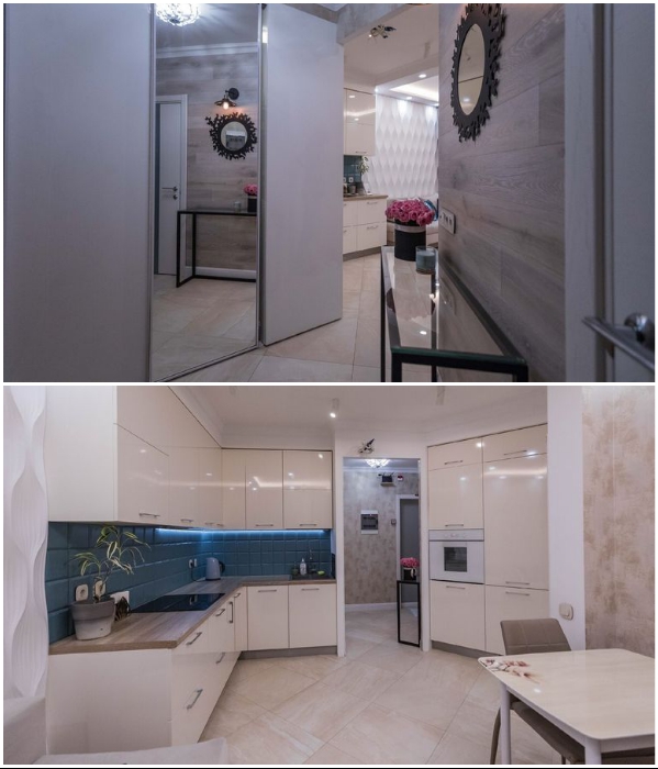 За зеркальной дверью спрятали вместительную гардеробную. | Фото: onashem.mediasole.ru.При входе в квартиру удалось создать хоть небольшую, но все-таки прихожую, в которой получилось организовать полноценную гардеробную. Учитывая, что квартира имеет совсем небольшую площадь, выделение зоны хранения позволит избежать нагромождения мебели в спальне и гостиной. Как ни крути, но каждая семья со временем обрастает большим количеством личных вещей и дополнительной техникой, поэтому наличие скрытой гардеробной никому не помешает. В этом же случае было решено ее спрятать за зеркальной раздвижной дверью, чтобы визуально увеличить крошечное пространство и обеспечить прихожую зеркалом во весь рост.