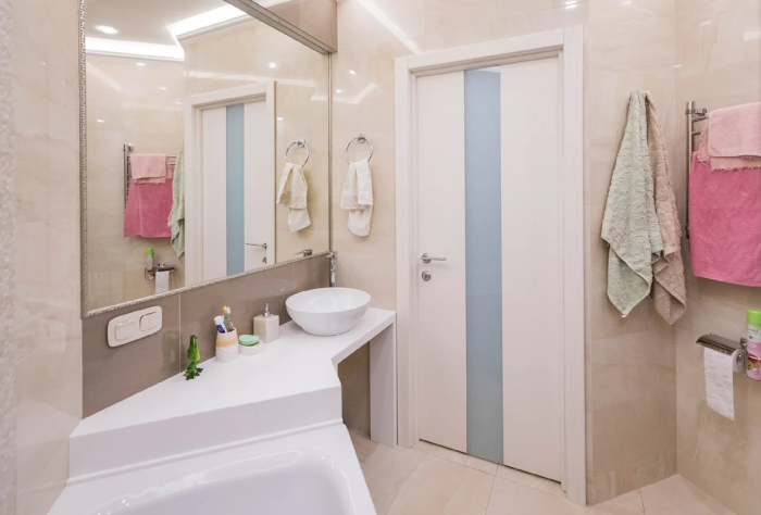 Наглядное подтверждение того, что диагональное расположения перегородки помогает увеличить площадь. | Фото: hit.miformat.info.Поскольку расположение ванной комнаты было предусмотрено генеральным планом дома, то менять ничего не стали, да и по закону это запрещено. Громоздкие коммуникации пришлось спрятать за коробом, который облицевали не привычной глянцевой плиткой, а декоративной штукатуркой. Она специальный раствор, который хорошо переносит перепад температур и влагу, не образовывая отслоек или распространения плесени. Такая же отделка повторилась и вдоль стены, где установили полноценную ванну, а вот экран, закрывающий ее нижнюю часть, сделан из керамической плитки, которой покрыли пол. Чтобы придать объема этой комнате, помимо большого зеркала над рукомойником, был установлен вместительный шкаф для банных принадлежностей с глянцевыми фасадами дверей. В общем же, дизайнеру удалось создать расслабляющую и умиротворенную обстановку, грамотно используя бело-песочные тона отделки, мебели и сантехнического оборудования.