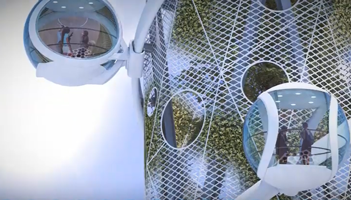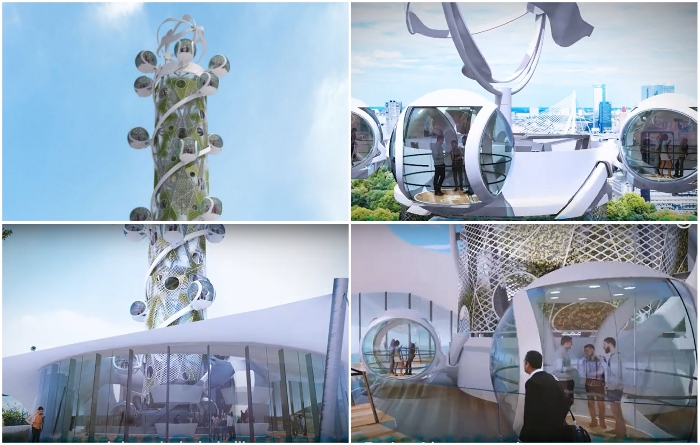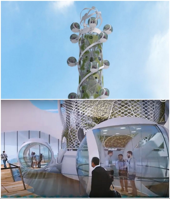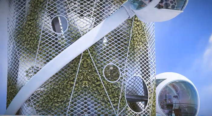 В зависимости от высоты здания, длительность поездки на обзорном лифте будет составлять от 3 до 10 минут (концепт «Spiral Tower»). | Фото: youtube.com/ © NorthernLight.Поскольку еще никак не могут определиться, какой же высоты будет сам небоскреб, получивший название «Spiral Tower», то количество пассажирских кабин может колебаться от 4 до 16. Естественно они будут управляться интеллектуальными системами, впрочем, и все, что находится внутри здания или за его пределами (окна с виртуальными изображениями, уход за вертикальным садом, расход ресуров и т.д.).