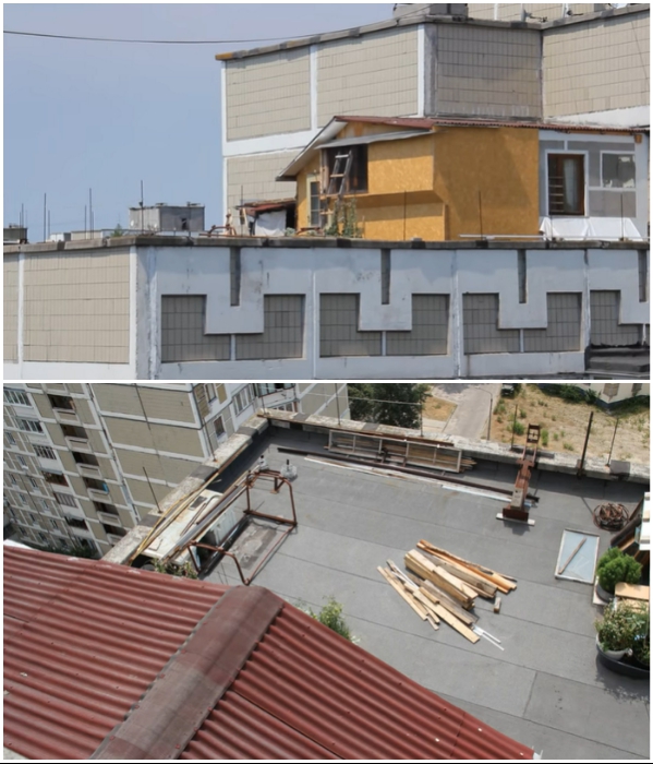 Так начиналось строительство дачи на крыше 12-ти этажного дома. | Фото: youtube.com/ © Украина.РУ.Для начала Петр Алексеевич отремонтировал ту часть кровли, которую он сам себе определил под дачный участок. Покрытие было не лучшем виде, оно и в дождь протекало, не то, чтобы выдерживать полив «сада-огорода». Учитывая плачевное состояние крыши, пенсионер сделал все необходимые изоляционные работы, уложил в два слоя толстый рубероид и лишь потом приступил к строительству домика.