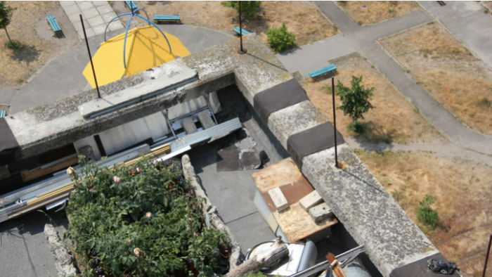 Высокая грядка с помидорами на крыше киевского многоэтажного дома по улице Лаврухина. | Фото: youtube.com/ © Украина.РУ.Для начала мужчина пристроил летний дачный дом 12 кв.м из плит ДСП, который со временем был достроен. Чтобы не нарушать закон, запрещающий вынос каких-либо коммуникаций за пределы квартиры, мужчина не стал испытывать судьбу и никаких удобств в виде электричества, воды, канализации или отопления к своей даче проводить не стал, но грядки и клумбы все-таки разбил. За 10 лет существования импровизированной дачи Карлсон, так его называют жильцы дома, обжился и обзавелся целым подворьем. На грядках нашла свое место старая ванна, чтобы хранить дождевую воду, ведь они с женой на городской даче выращивают зелень, сезонные овощи и цветы.