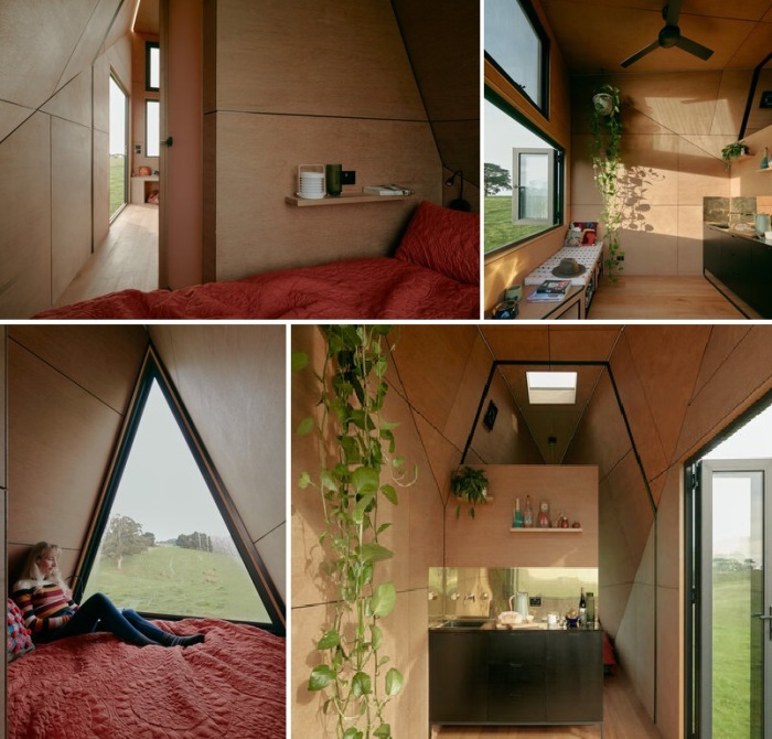 А-образная конструкция домика намного практичней и экономичней («Base Cabin», Мельбурн). | Фото: dezeen.com.Хотя в реальной жизни подобная конструкция каркаса оказалась довольно практичной и экономичной, позволяющей организовать сразу 3 комнаты на площади всего лишь 15 кв. м. Поскольку этот мобильный домик имеет классическую А-образную каркасную форму, то на его создание ушло намного меньше стройматериалов, чем для стандартного сооружения прямоугольной формы.
