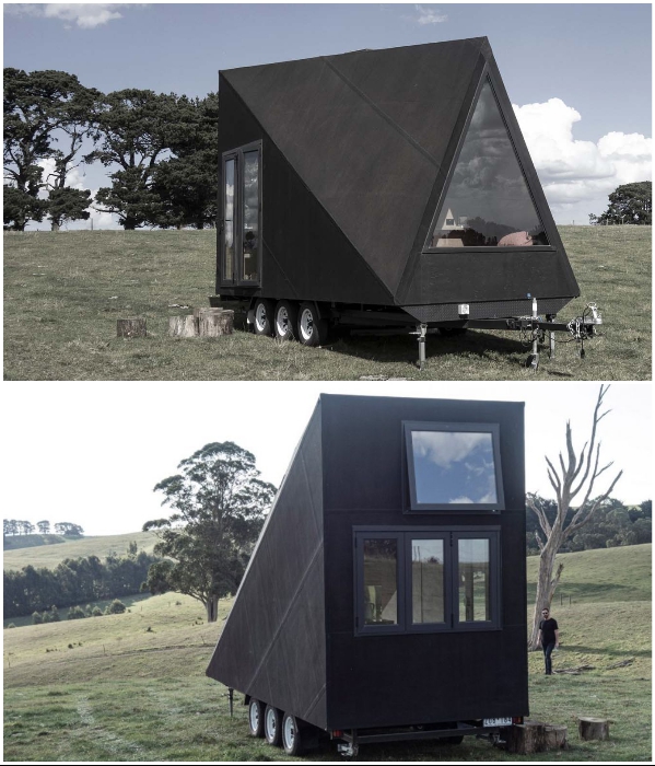 Микро-дом на колесах полностью обтянули атмосфероустойчивой резиной («Base Cabin», Мельбурн). | Фото: vinegred.ru.Но главной отличительной чертой этого мобильного дома стала не столько форма, сколько отделка экстерьера. По сведениям авторов Novate.ru, «Base Cabin», так назвали свое творение авторы проекта, полностью обтянуто ...атмосферостойкой резиной черного цвета. Такое странное решение они объясняют тем, что благодаря черному цвету этот микро-коттедж полностью сливается с окружающей средой, а резина – позволяет продлить срок эксплуатации и дополнительно обеспечивает звуко- и теплоизоляцией.