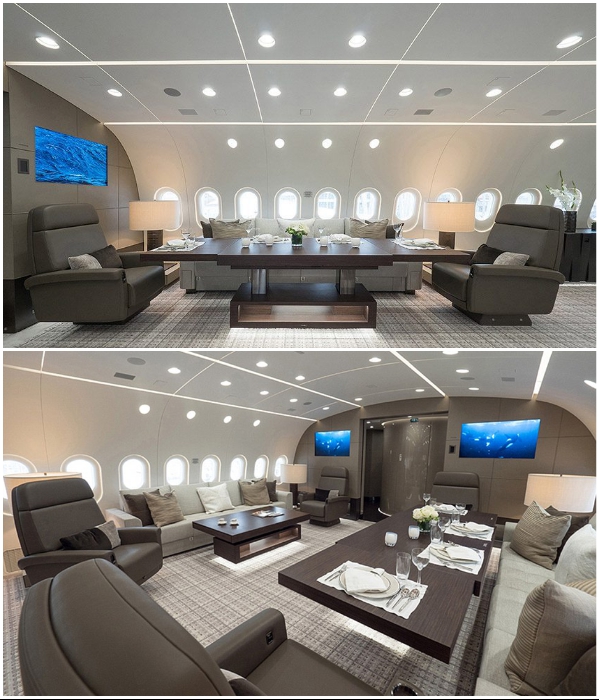 Общая лаунж-зона на борту роскошного самолета VVIP Boeing787 Dream Jet. | Фото: bigpicture.ru.По сведениям редакции Novate.ru, эксклюзивная «птичка» обошлась создателям - компании Kestrel Aviation Management в более чем 291 млн дол., что сразу намекает на то, как разработчики и дизайнеры постарались, чтобы удовлетворить малейшую прихоть путешествующих. Несмотря на то, что эта модель самолета намного больше стандартного Boeing787, вмещающего 355 (!) пассажиров, этим бортом может путешествовать компания, состоящая не больше чем из 30 человек.
