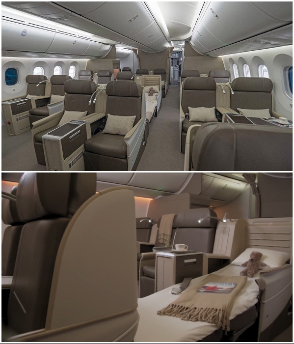 В этом самолете иллюминаторы заметно больше обычных (VVIP Boeing787 Dream Jet). | Фото: kestrelaviation.com.Все эти зоны имеют огромные как для авиалайнера иллюминаторы, из которых открывается фантастический обзор, причем с любой зоны или уединенного спального места. Также стоит отметить, что на оформлении интерьера французский дизайнер Jacques Plerrejean вместе со своей командой совсем не экономил: эксклюзивная мебель из красного дерева и с кожаной обивкой, полированный светлый мрамор и цельный массив дуба в отделке ванных комнат, изысканный текстиль и дизайнерская посуда, ультра современная техника и наборы туалетных принадлежностей от Jo Malone. Все это великолепие поддерживает в порядке вышколенный экипаж, который также одет в дизайнерскую форму.