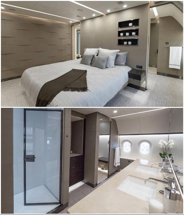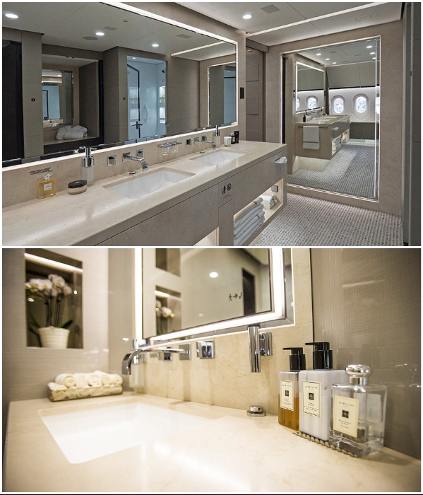 На борту авиалайнера обустроили 8 индивидуальных кают со спальнями и ванными комнатами (VVIP Boeing787 Dream Jet). | Фото: germany.nashieu.com.К услугам избранных путешественников предоставляется практически 700 кв. м поистине королевской роскоши и современного комфорта. На борту по высшему разряду обустроены: 8 уединенных спален с полноценными ванными комнатами, огромный обеденный зал, конференц-зал, общая лаунж-зона с кинозалом, еще несколько ванных комнат для тех, кто будет отдыхать на полностью раскладывающихся креслах в общей каюте.