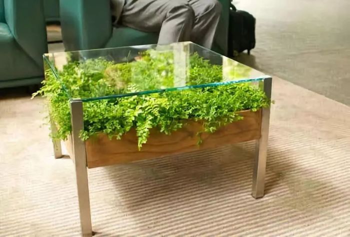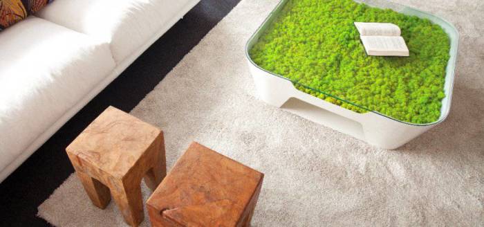 Журнальный столик, поверхность которого полностью заполнена мхом. /Фото: topiar.uaЖивой уголок можно устроить в любой комнате квартиры. Не обязательно это должны быть целые зеленые стены или заросли комнатных цветов. Оригинальное «живое» оформление журнальных столиков привнесет нужный природный акцент в интерьер и сделает его более умиротворяющим и естественным. Под стеклом можно разместить неприхотливый мох, различные по расцветке суккуленты или другие растения с небуйным ростом.