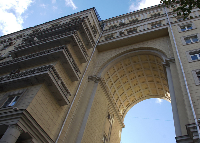 Дом имеет двадцатиметровую арку - самую высокую в столице / Фото: m.ok.ruНо главная его особенность, визитная карточка – это необычная и самая высокая в столице арка. В высоту она достигала приблизительно двадцать метров. Существовала даже версия, что в планах у городских властей было в будущем установить во дворе скульптуру Иосифа Виссарионовича Сталина довольно внушительных размеров, поэтому и сделали такую арку, чтобы можно было без проблем ее туда транспортировать. Естественно, это всего лишь домыслы и предположения.