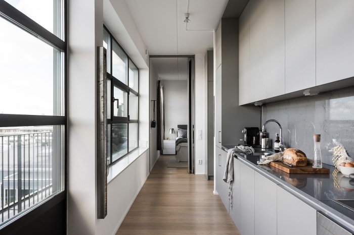 Еще одним важным решением станет формат техники. Для узкой кухни скорее всего вам придется найти раковину поменьше, плиту подобрать двухконфорочную, а холодильник и микроволновку встроить, чтобы не привлекали излишнего внимания. Кстати, и фартук стоит выбрать в тон гарнитуру и столешницы, чтобы не слишком выделялся.Балкон или остекленная лоджия при этом служат источником вдохновения — здесь хочется поставить холодильник или плиту. По закону вы можете перенести туда все, кроме раковины и газовой плиты.