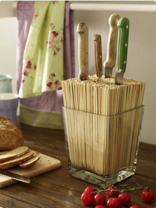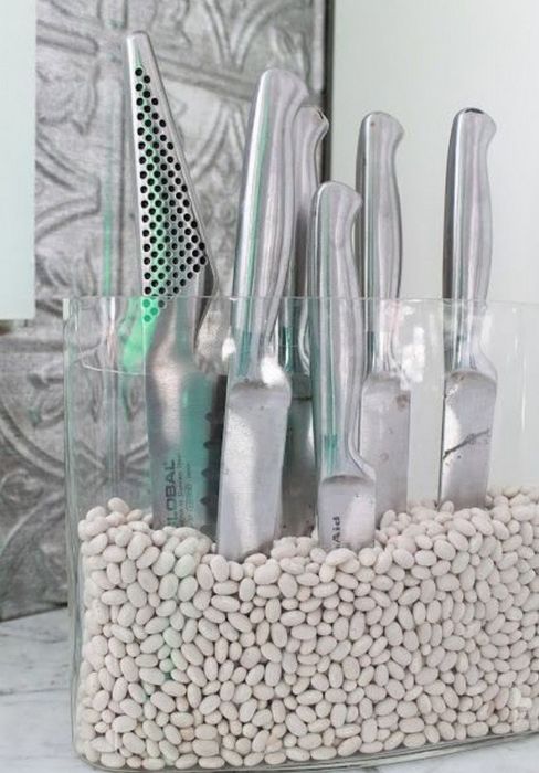 Ножи в бамбуковых палочках. /Фото: domosedy.comДля этого можно использовать любую жестяную, стеклянную или деревянную емкость, которая украшается, а потом заполняется бамбуковыми палочками, фасолью, макаронами или рисом. Наполнитель должен заполнять всю внутреннюю часть, чтобы ножи не болтались.