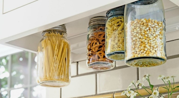 Очень удобное и экономящее пространство расположение круп. /Фото: socialjam17.files.wordpress.comЭтот прием подходит не только для декоративного оформления, но и для значительной экономии пространства в кухонных шкафах. Помимо этого расположенными таким образом крупами или специями очень удобно пользоваться, ведь они всегда под рукой. Для закрепления баночек можно использовать магнитную доску или саморезы, которым крышки емкостей вкручиваются прямо в нижнюю часть кухонных ящиков.