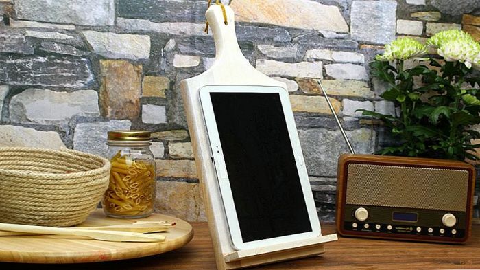Разделочную доску можно использовать для создания оригинальной подставки под гаджет. /Фото: nastroy.netЧтобы создать из кухонной разделочной доски экстравагантную подставку для планшета, необходимо потратить не более двух часов. Зато какое полезное дополнение для удобного чтения книг за столом с кружечкой чая или приготовления блюд по рецепту на любимом электронном сайте. Для изготовления подставки подойдет даже старая доска, которая уже не используется на кухне, предпочтительно, чтобы она была деревянной. По размеру доска должна быть хотя бы немного больше планшета. На ее нижней части необходимо закрепить небольшую деревянную планку. Лучше всего будет использовать кусочек молдинга, который будет смотреться более изящно.
