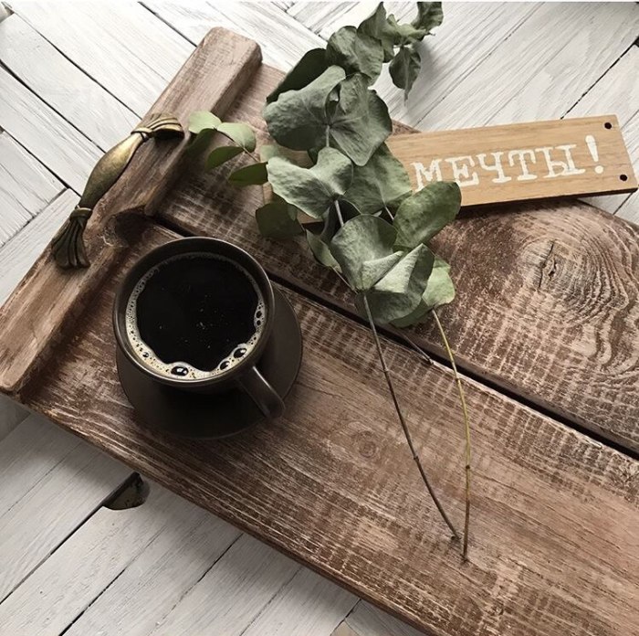 Из обычного деревянного ящика получается отличный вместительный поднос. /Фото: i.pinimg.comСейчас в моду вошли подносы, которые довольно таки сильно похожи на разделочные доски, либо имеют небрежный стиль. Создать такие без труда можно даже самостоятельно. Для этой цели подойдет ненужный деревянный ящик или доска, к которым потребуется прикрепить ручки. Роль ручек могут сыграть прочные толстые веревки, кусочки старого ремня, закрепленного с помощью саморезов, мебельная гарнитура или другие подходящие элементы. Дерево можно покрасить в один или несколько цветов, покрыть лаком или искусственно состарить, подчеркнув фактуру.