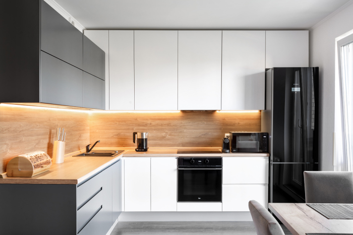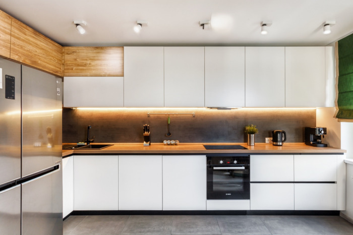 Самым простым же вариантом будет техника в черном глянце или стали, холодильник side-by-side, а также плита или раковина на острове, что соответствует модным трендам.